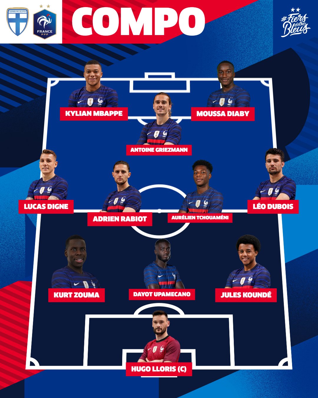 Lloris cap Dubois Varane Lenglet Digne Coman Tchouaméni ou Veretout Pogba Rabiot Griezmann Benzema. Découvrez tout ce quil faut savoir sur la rencontre. Tout savoir sur la rencontre entre la Finlande et la France iconsport Ce mardi soir 20h45 lEquipe de France affrontera la Finlande au Helsinki Olympic Stadium lors des éliminatoires de la Coupe du Monde 2022.